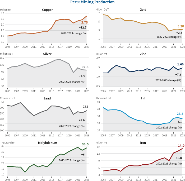 In 2023, the precious metals segment witnessed record-breaking prices. Gold initially decreased after the Feds attempted to control inflation but gained appeal as a safe haven asset due to geopolitical events and increased central bank reserves. The closing average price for gold in 2023 was US$2,033.31/oz. Gold in Peru demonstrated a strong performance, with a 2.8% increase in gold production (3.1 million oz produced in 2022 vs 3.2 million oz in 2023).