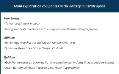 Two private junior companies are also looking at lithium on their respective licenses, but their focus on lithium is not exclusive: Gobi Venture has a multitude of metals to choose from at its Naran project in the Gobi area, among which it found an open lithium mineralization that the explorer plans to further investigate. Asian Battery Minerals has three different projects across commodities (lithium, graphite, copper-nickel) that it seeks to develop concomitantly. Its Tsagaan Ders lithium prospect in the Dundgobi region is early-stage, to be drilled later this year.